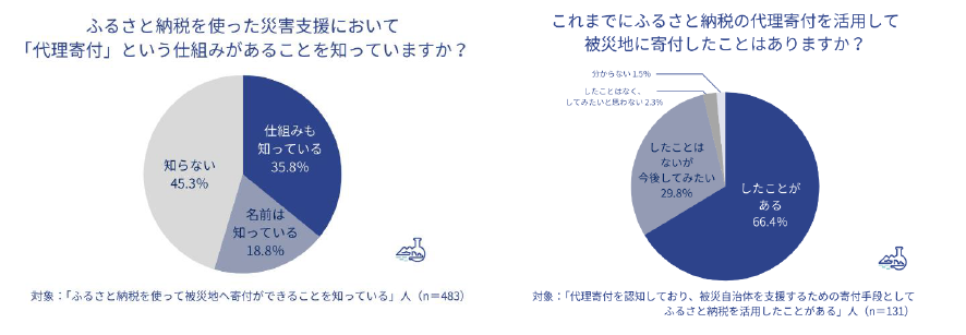 ◆ふるさと納税で被災自治体に寄付できることを知っている人のうち、代理寄付という仕組みがあることを「知っている」人が35.8%、「仕組みは知らないが名前は知っている」という人が18.8%。仕組みを知っていると回答した人のうち、「代理寄付を活用して被災地に寄付したことがある」という回答が66.4%、「したことはないが今後してみたい」が29.8%となった。