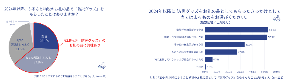 ◆2024年以降、ふるさと納税のお礼の品として防災グッズを受け取ったことが「ある」という回答が26.1%、「ないが興味はある」が37.8%となった。ふるさと納税で防災グッズをもらうことを検討したきっかけは「能登半島地震」が53.2%、僅差で「南海トラフ地震臨時情報」が52.3%と回答。