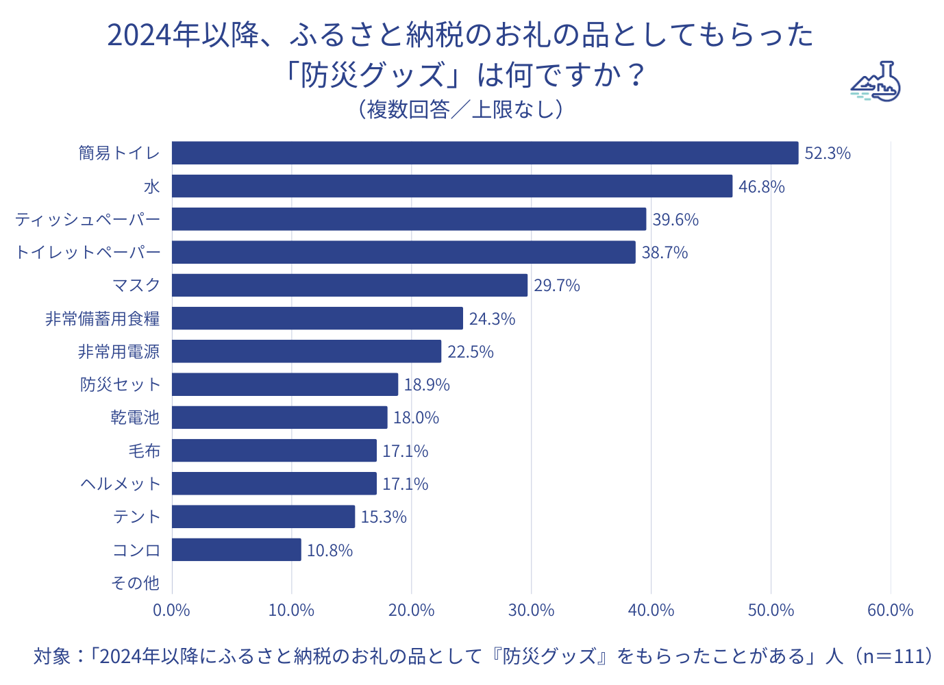 ◆お礼の品として受け取った防災グッズは、「簡易トイレ」が最多で52.3%、続いて「水」(46.8%)、「ティッシュペーパー」(39.6%)、「トイレットペーパー」(38.7%)となった。