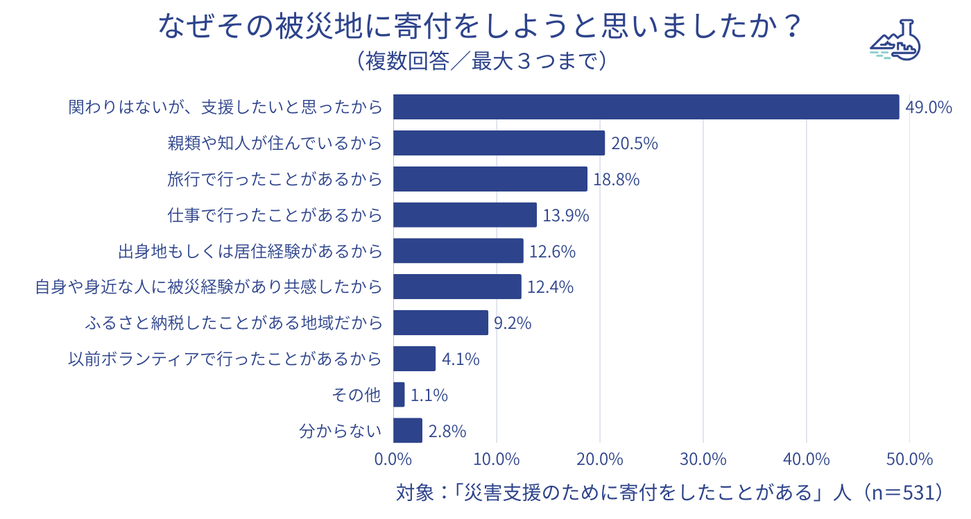 ◆被災地に寄付しようと思った理由は、最多が「(特段その地域との)関わりはないが、支援したいと思ったから」が49.0%。また、ふるさと納税での災害支援寄付経験者は、寄付をした地域との関わりを理由に挙げた人が多く「親類や知人が住んでいるから」が43.6%、「仕事で行ったことがあるから」が29.3%、「旅行で行ったことがあるから」が27.9%という結果となった。