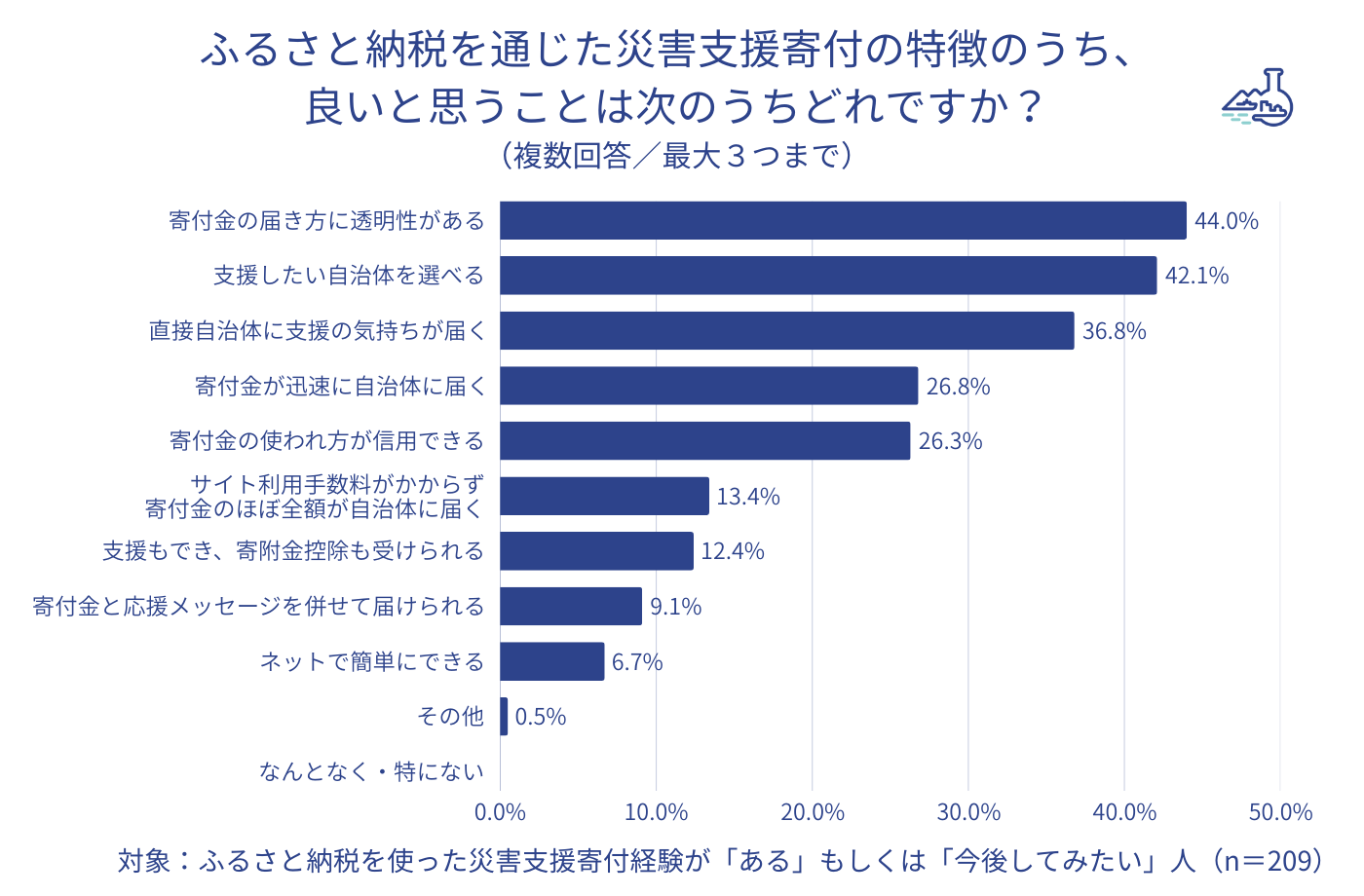 ◆ふるさと納税による災害支援寄付の「良い」と思う特徴は「寄付金の届き方に透明性がある」44.0%が最も支持された。ほぼ並んで「支援したい自治体を選べる」42.1%も評価されたほか、「直接自治体に支援の気持ちが届く」「寄付金が迅速に自治体に届く」「寄付金の使われ方が信用できる」も回答を集めた。