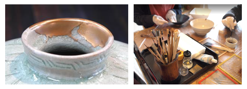 破損した陶磁器を漆でつなぎ合わせて補修する昔ながらの技法で、補修した部分を金で装飾します。