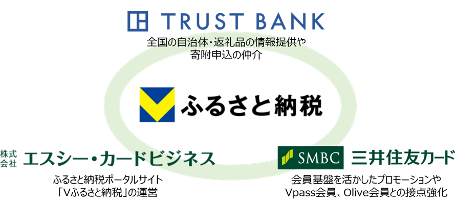 三井住友カード、エスシー・カードビジネス、トラストバンクは、地域課題の解決や地域創生に向けた多様な取り組みを重ねる中で、「地域を元気にしたい」という共通の想いで一致し、「Vふるさと納税」を協働で推進する運びとなりました。