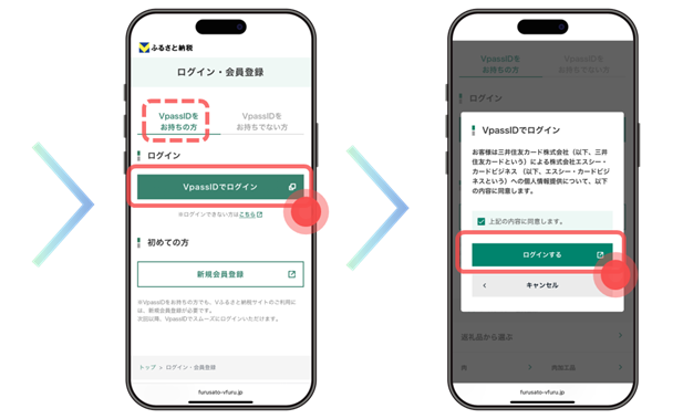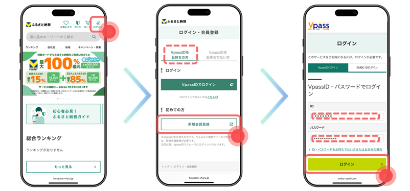 三井住友カードの会員向けサービス「Vpass」会員の方は、VpassIDを用いて会員登録やログインをすることが可能です。一度会員登録をしていただくと、Vpassにログインしている状態から「Vふるさと納税」に遷移した際、IDやパスワードを入力する手間を省くことができます。2025年内には、Vpass内のアイコンから「Vふるさと納税」ページに直接アクセスできるよう開発をしております。なお、VpassIDをお持ちでない方も、「Vふるさと納税」をご利用いただくことは可能です。