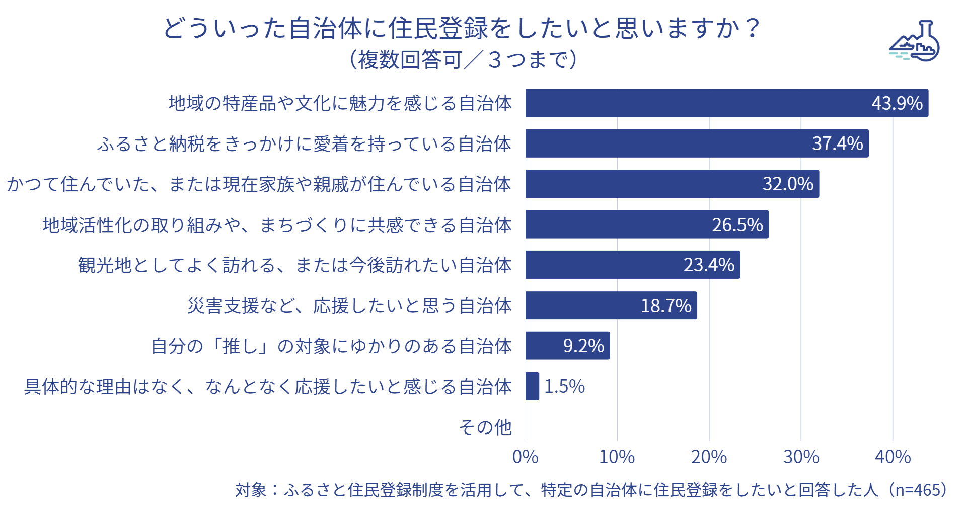 「ふるさと住民登録制度を活用して、特定の自治体に住民登録をしたい」と回答した人は、全体の42.2%にのぼりました。登録したい自治体としては、「地域の特産品や文化に魅力を感じる自治体」(43.9%)が最も多く、次いで「ふるさと納税をきっかけに愛着を持っている自治体」(37.4%)が挙がりました。ふるさと納税制度が、地域への愛着形成や継続的な関係づくりに寄与している傾向が見受けられます。