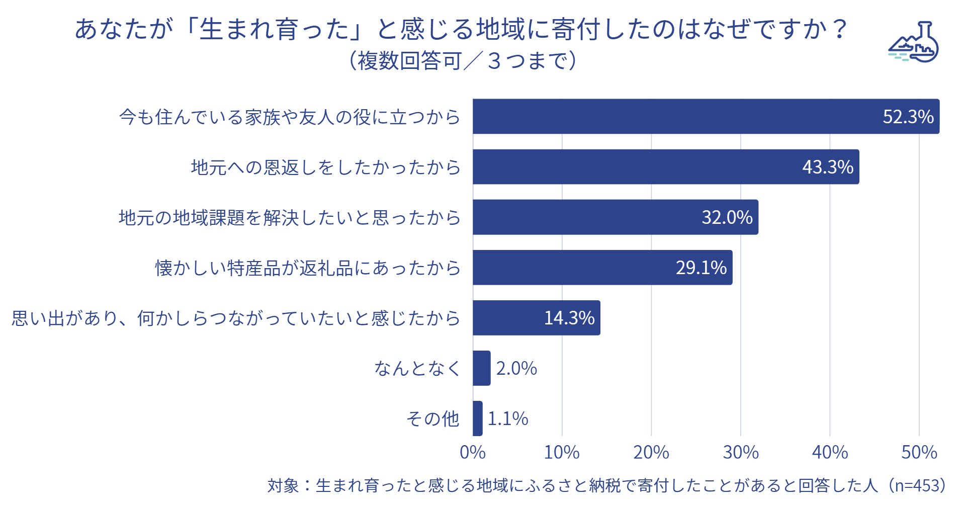 寄付先として「生まれ育った地域」を選んだことがある人は全体の41.1%にのぼりました。その理由としては、「今も住んでいる家族や友人の役に立つから」(52.3%)や「恩返しをしたいから」(43.3%)といった、個人的なつながりや感謝の気持ちに基づいた動機が上位を占めています。