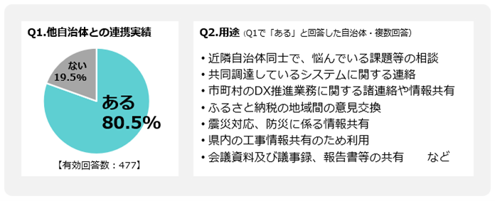 LoGoチャットの大きな特徴は、導入している自治体の庁内だけでなく、他自治体とも連携が可能なことです。同利用実態調査では回答数(注2)のうち、80.5%が他の自治体とLoGoチャット上で連携を実施していることがわかりました(図)。具体的には「近隣自治体同士で悩んでいる課題等の相談」や「災害対応、防災に係わる情報共有」、「市町村のDX推進業務に関する諸連絡や情報共有」など、同じ業務を行う部署間での情報共有や広域事業における連携など、活用の場は多岐にわたっています 。