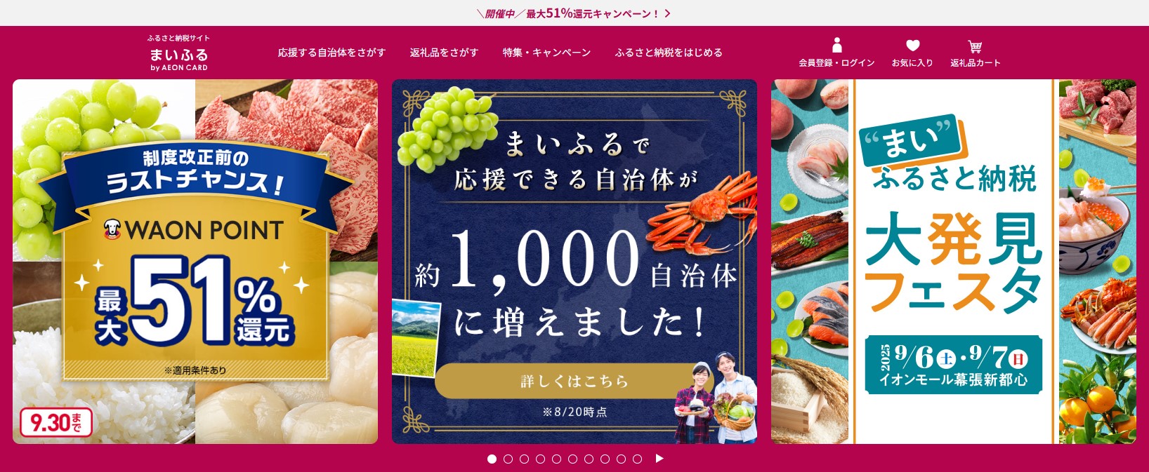 国内最大級のふるさと納税総合サイト「ふるさとチョイス」を企画・運営する株式会社トラストバンク(本社:東京都品川区、代表取締役:福留大士、以下「トラストバンク」)は、本日8月21日、イオンフィナンシャルサービス株式会社(本社:東京都千代田区、代表取締役社長:深山友晴、以下「イオンフィナンシャルサービス」)が運営するふるさと納税ポータルサイト「まいふる by AEON CARD」( https://www.furusato.aeon.co.jp/ )に、全国のお礼の品や自治体情報を連携するOEMサービスを提供開始したことをお知らせします。これにより、ふるさとチョイスと契約している自治体の一部を含む、全国約1,000自治体のお礼の品が、「まいふる by AEON CARD」上でも選択・お申し込み可能になります。