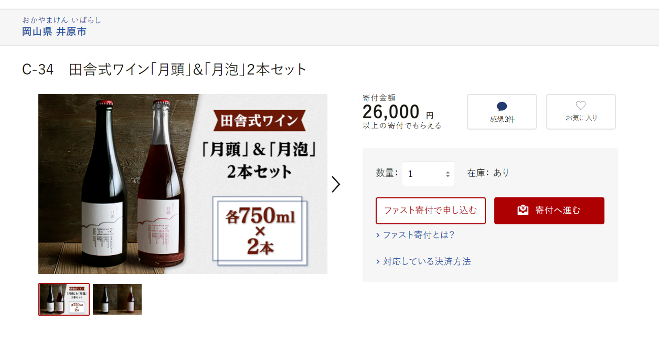 ふるさとチョイスでも岡山県井原市の「無添加ワイン」を選んで寄付しました。美味しかったです。飲んでも悪酔いせず、次の日にも残らない。おすすめです!