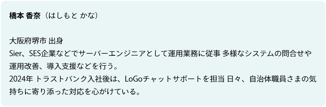 その評価の裏には、どのような思想と努力があるのでしょうか。私たちはその答えを求めて、日々、最前線で自治体と向き合うテクニカルサポート担当、パブリテック事業部 プロダクトグループの橋本さんにお話を聞きました。入社からまもなく1年。彼女の言葉から見えてきたのは、単なる問題解決に留まらない、お客様に寄り添うサポートの哲学でした。