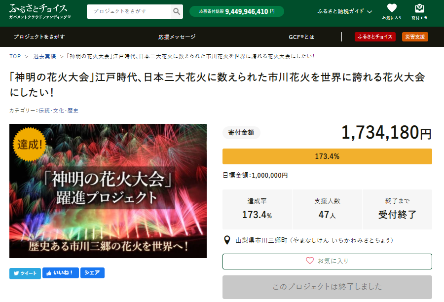 市川三郷町は2019年、神明の花火大会のフィナーレの資金を集めるためにGCFを実施しました。