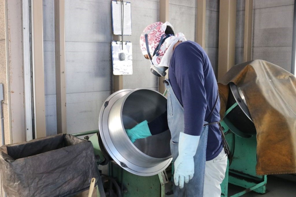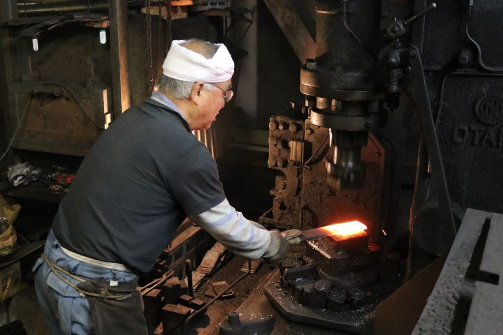 ギコギコといった機械の音。刃物特有のにおい。カンカンカンと鉄を叩く音。作業するのは、越後与板打刃物の伝統工芸士に認定されている水野清介さんと、弟子に入った似鳥透さんです。