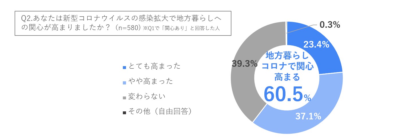 トラストバンクが今年6月、都内に住む約1000名に実施した「地方暮らしに関するアンケート※」によると、「新型コロナで地方暮らしへの関心が高まった」と答えた人は、前年調査より14.5%増加し、60.5%に上りました。コロナ禍で在宅勤務をする人が増え、地方暮らしやワーケーションへの関心が高まりつつあります。
