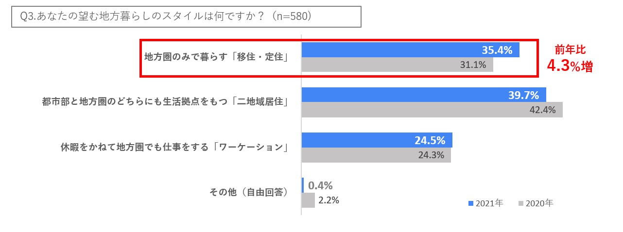 希望する地方暮らしのスタイルで一番人気が高いのは、都市圏と地方圏のどちらにも生活拠点を持つ「二地域居住」。割合は39.7%で昨年比2.7%減でした。一方、地方圏のみで暮らす「移住・定住」の人気が昨年より4.3%増加し35.4%という結果になりました。