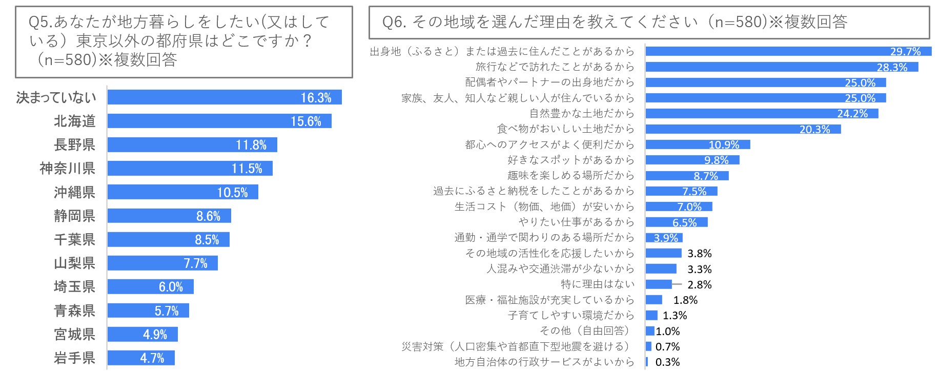 東京以外の都道府県のうち、地方暮らしをしたい場所のトップは北海道。次いで長野県、神奈川県がランクインしました。選んだ理由は「出身地・住んだことがある」が最多でした。