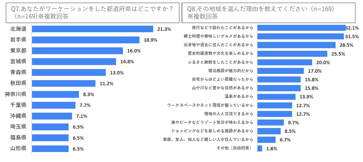 一方、実際にワーケーションをした人が選んだ都道府県の人気No.1は、やはり北海道。岩手県、東京都が続く結果となりました。選んだ理由としては、「旅行で訪れたことがあるから」や「美味しいグルメがあるから」が多い結果に。