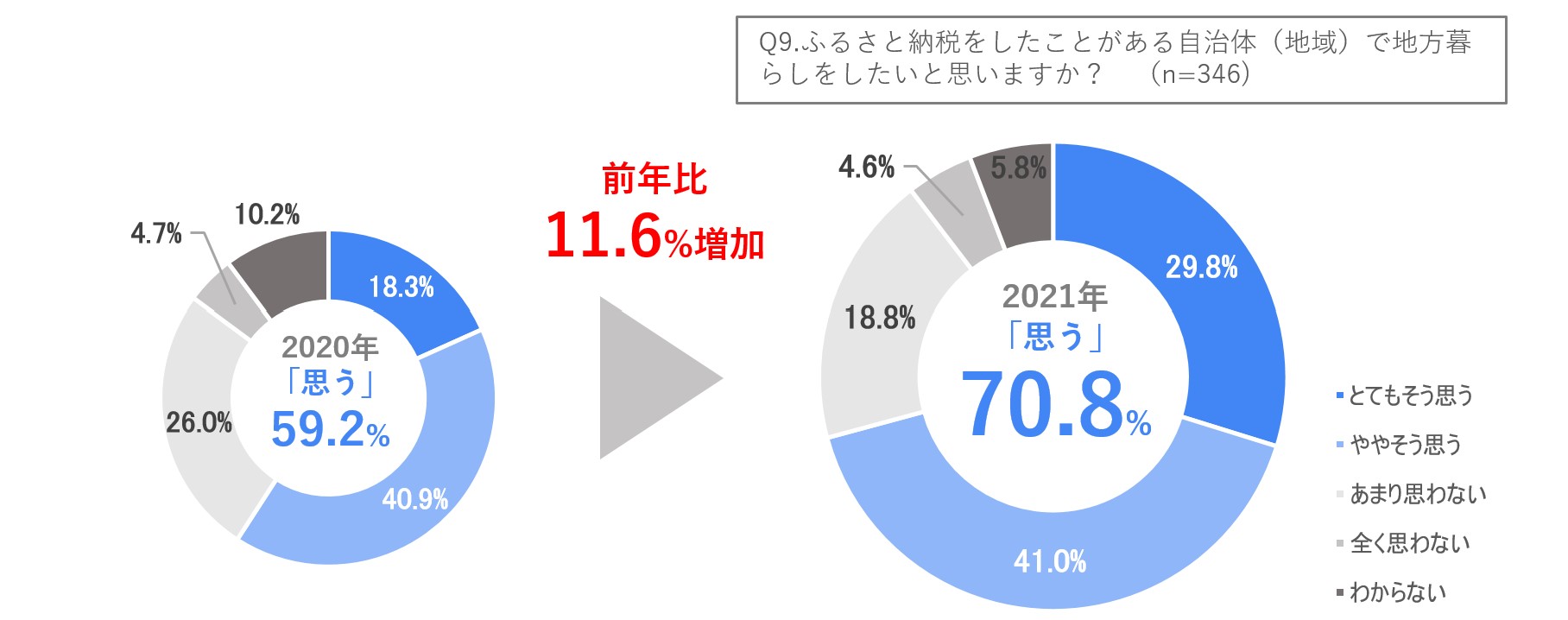 ふるさと納税をしたことがある人に「寄付先の地域で暮らしたいか」を尋ねたところ、70.8%の人が「そう思う」と回答。昨年から11.6%も増加しました。