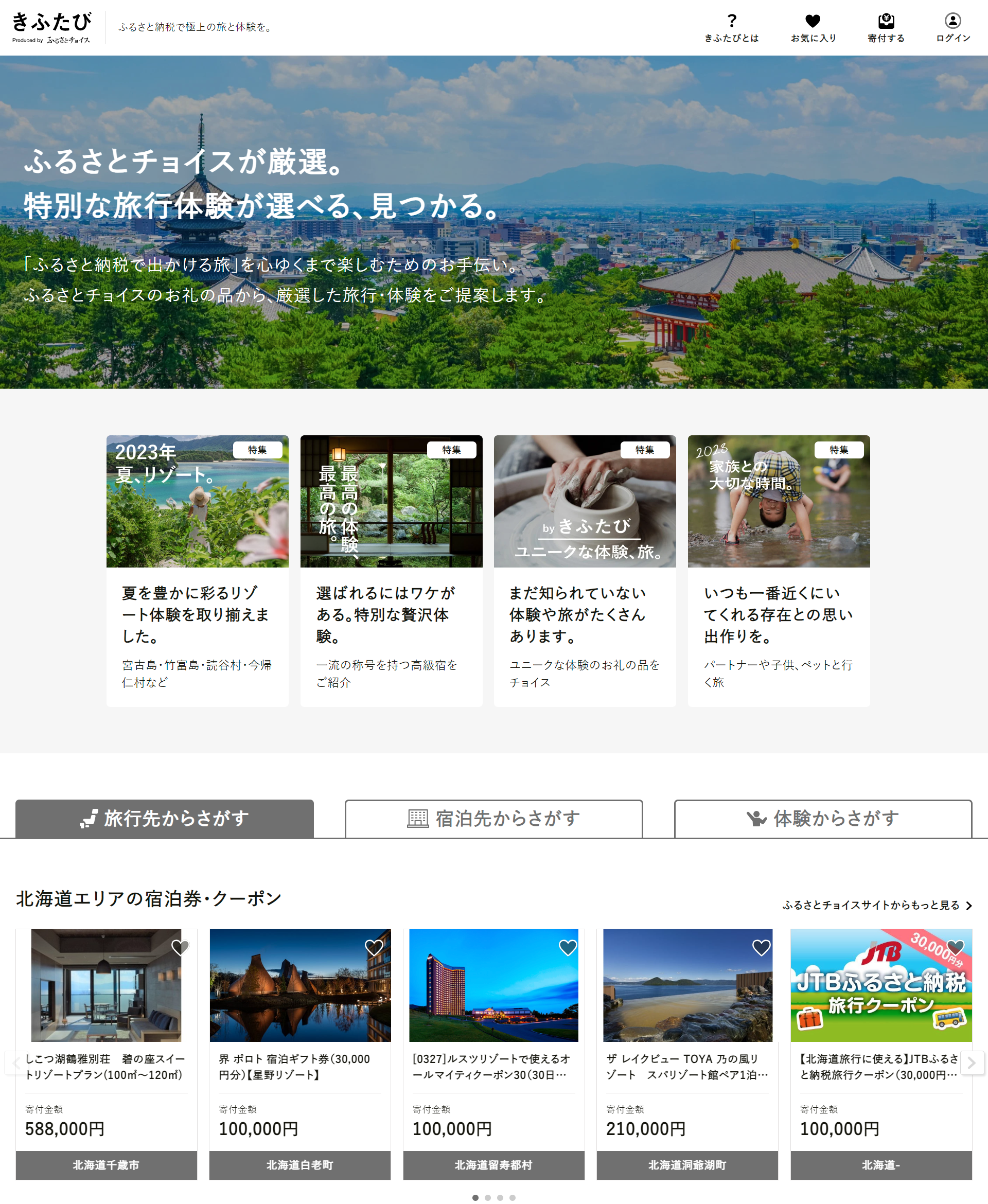 旅行をテーマに地域の魅力を伝えるwebサイト「きふたび」(https://www.furusato-tax.jp/kifutabi/)。ふるさとチョイスに掲載されている、宿泊や観光、アクティビティなど体験型のお礼の品を厳選して紹介しているWebサイトです。
