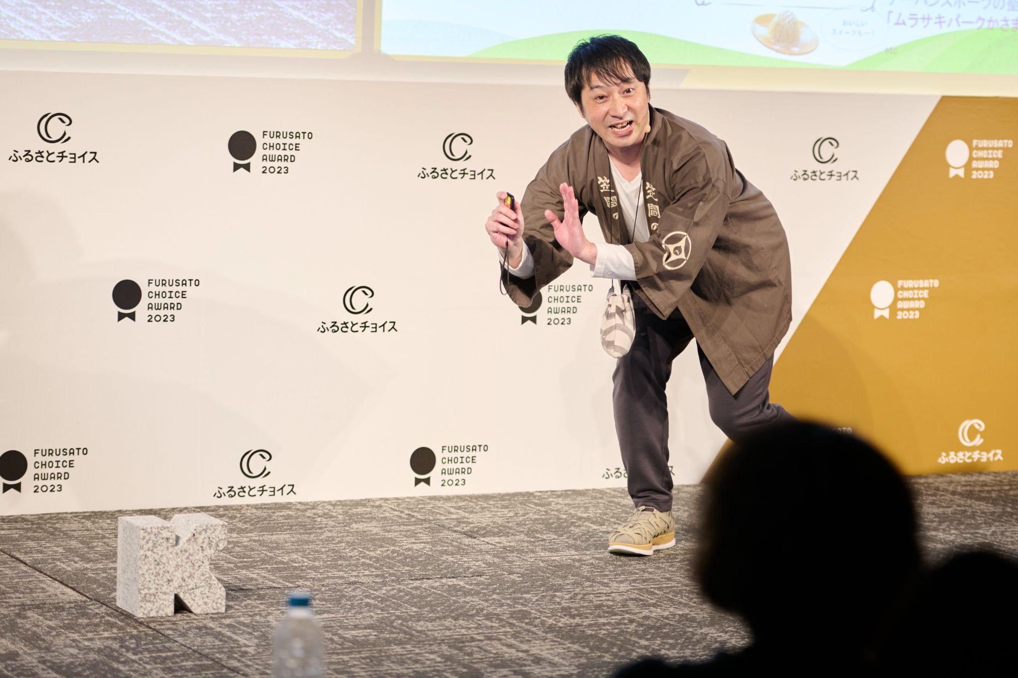 『チョイスルーキー部門』、最後は茨城県笠間市 企業誘致・移住推進課 ふるさと納税推進室の村上 俊和さんの発表です。地元の特産品である稲田御影石の実物(写真左下の石)のご紹介や、舞台上で練習したというムーンウォークを披露するなど、会場にいる皆さんを飽きさせないプレゼンテーションについ引き込まれてしまいました。