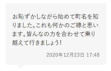 ・「ふるさと田布施に笑顔で帰って来れるまで頑張ります。素晴らしい企画をありがとうございました」(大阪府・男性・20代)