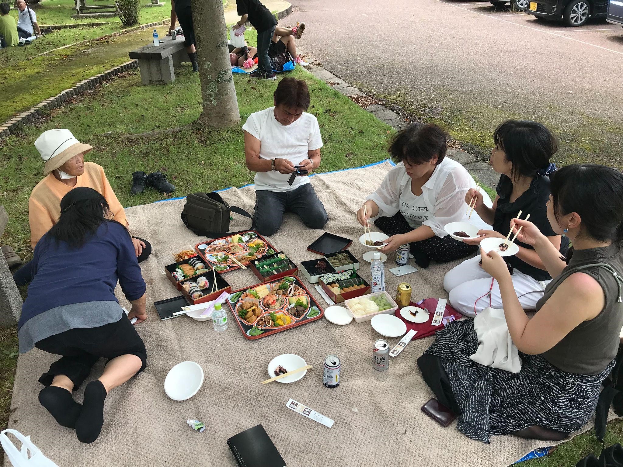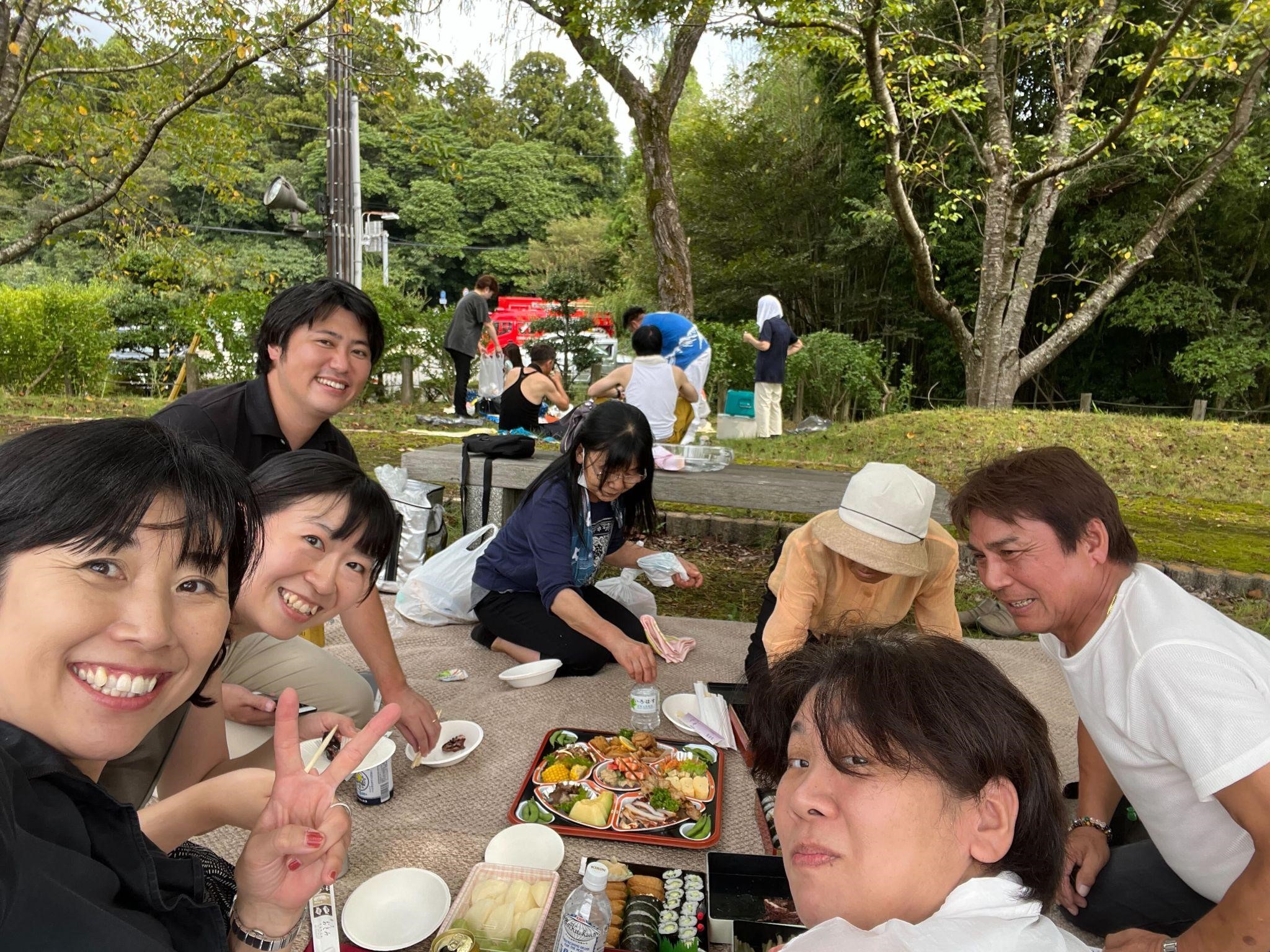 一番手前・向かって右側の方が、株式会社御祓川代表の森山さん。一番手前・向かって左側の方が、事業担当者の酒井さんです。森山さんの隣の男性が「中島アグリサービス」の松田さんです。(これから本文にご登場されます!)能登にお伺いした際はちょうど地元のお祭りの日で、「ヨバレ」(祭りの日に親戚や友人等を招いて、ごちそうでもてなす習慣)に呼んでいただいた際の写真です。(青空の下、「ごっつぉ」(能登の方言で”ごちそう”)をいただくのは最高でした…!)