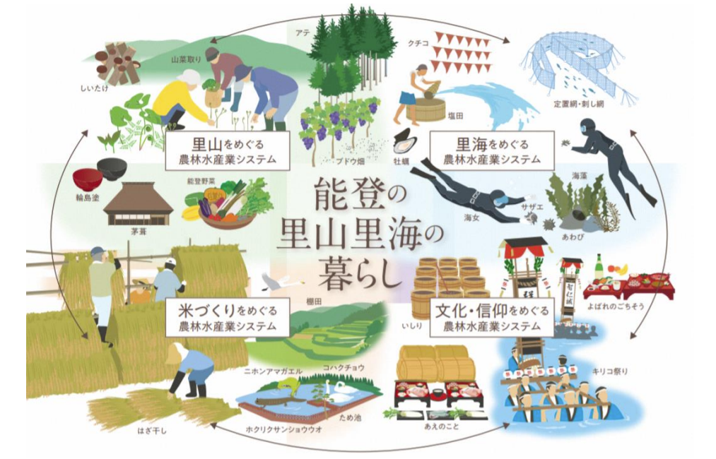能登地域では、日本海に突き出した丘陵上の半島という地形的条件も関係し、山では山菜やきのこを採り、田んぼでは米を作り、海では様々な漁法で魚を獲るなど、里山里海の多様な生態系の恵みを享受しながら、人々の暮らしが営まれてきました。里山と里海は密接に関係しており、各自の生業が組み合わされることによって、能登の地域全体で生計が維持されていると同時に里山里海の環境も維持されてきています。