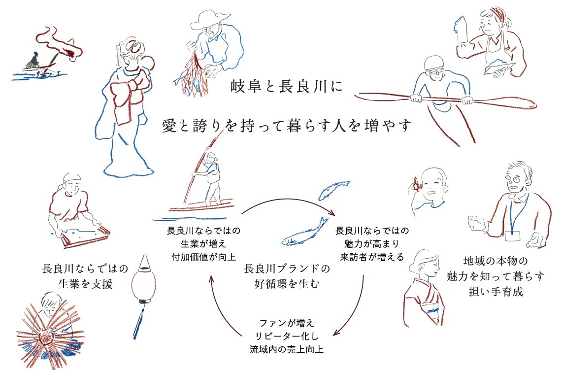 ORGANさんは2030年度をゴール年とし、「伝統的な生業が次世代に受け継がれている長良川流域の実現」の達成に向けて、多様なステークホルダーの参画を促し、伝統文化の新市場を開拓し、持続可能な仕組みを提案されています。