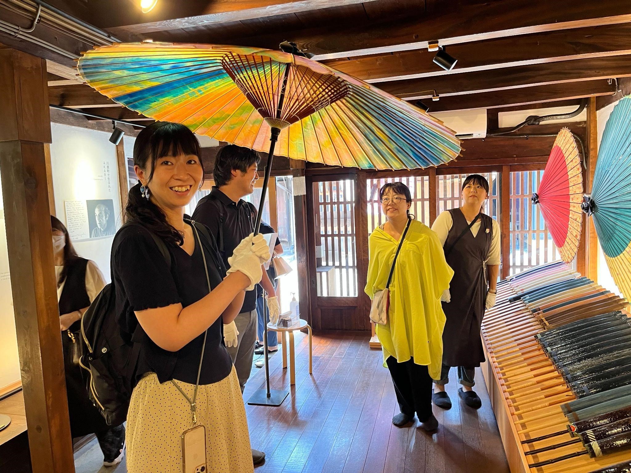 とても繊細で素敵な和傘を恐る恐る手に取る私。和傘は、閉じている状態では柄が全くわからないのですが、傘を開くと美しい色と柄が一気に広がるので、そのワクワク感も魅力だな、と感じました。