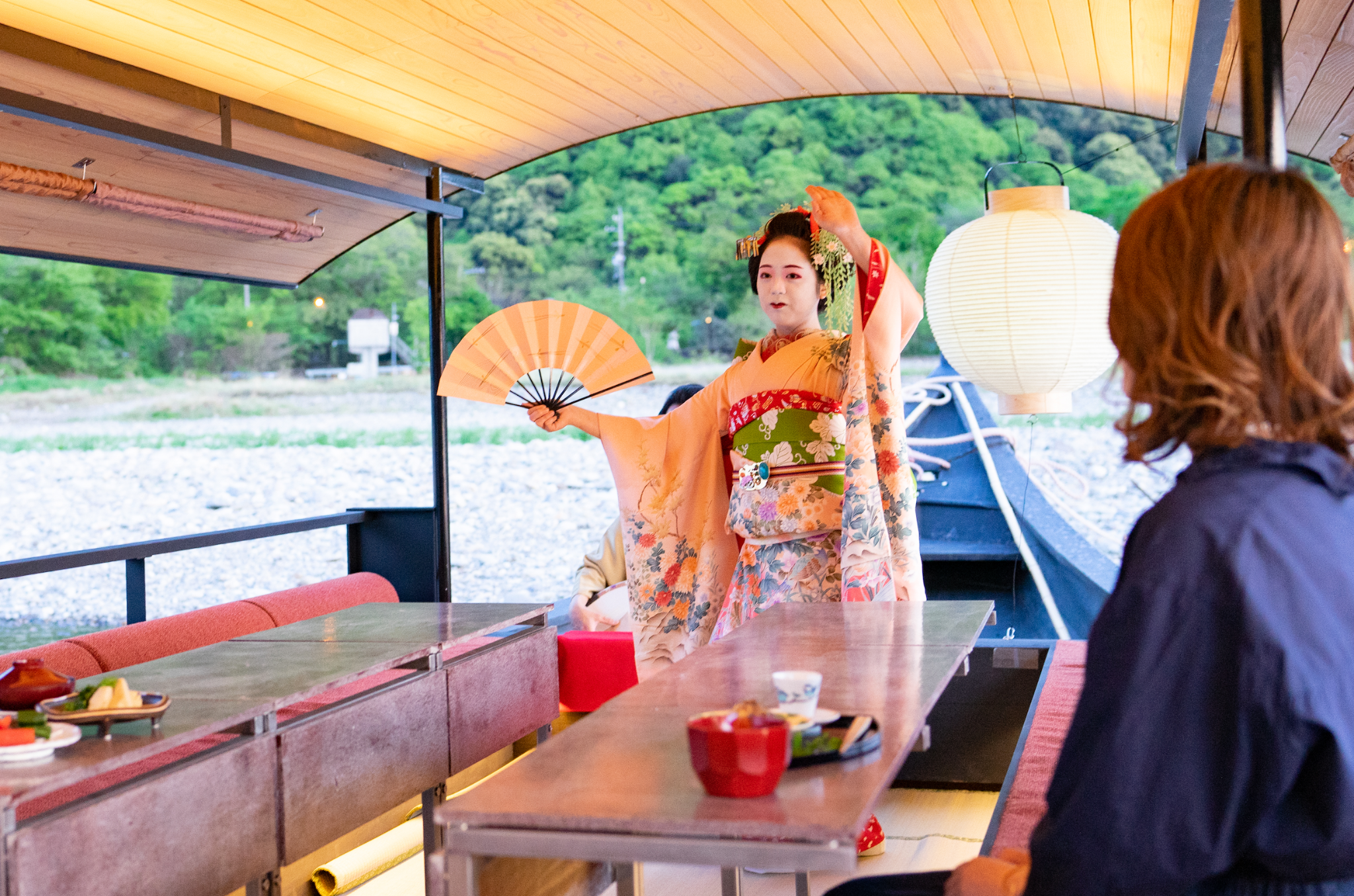 長良川の鵜飼観覧船での舞妓の船遊びのようす。長良川の鵜飼を楽しみながら、舞妓の舞も楽しめる、とても贅沢な時間です。(尚、私はまだ体験できておらず、こちらはORGANさんご提供の参考写真です)