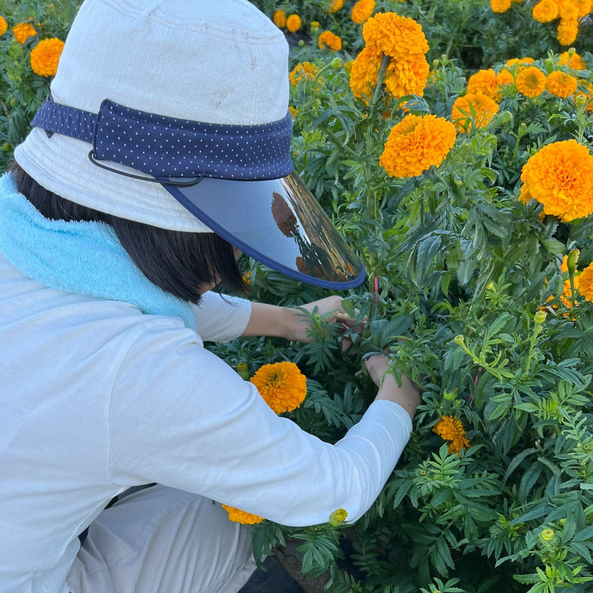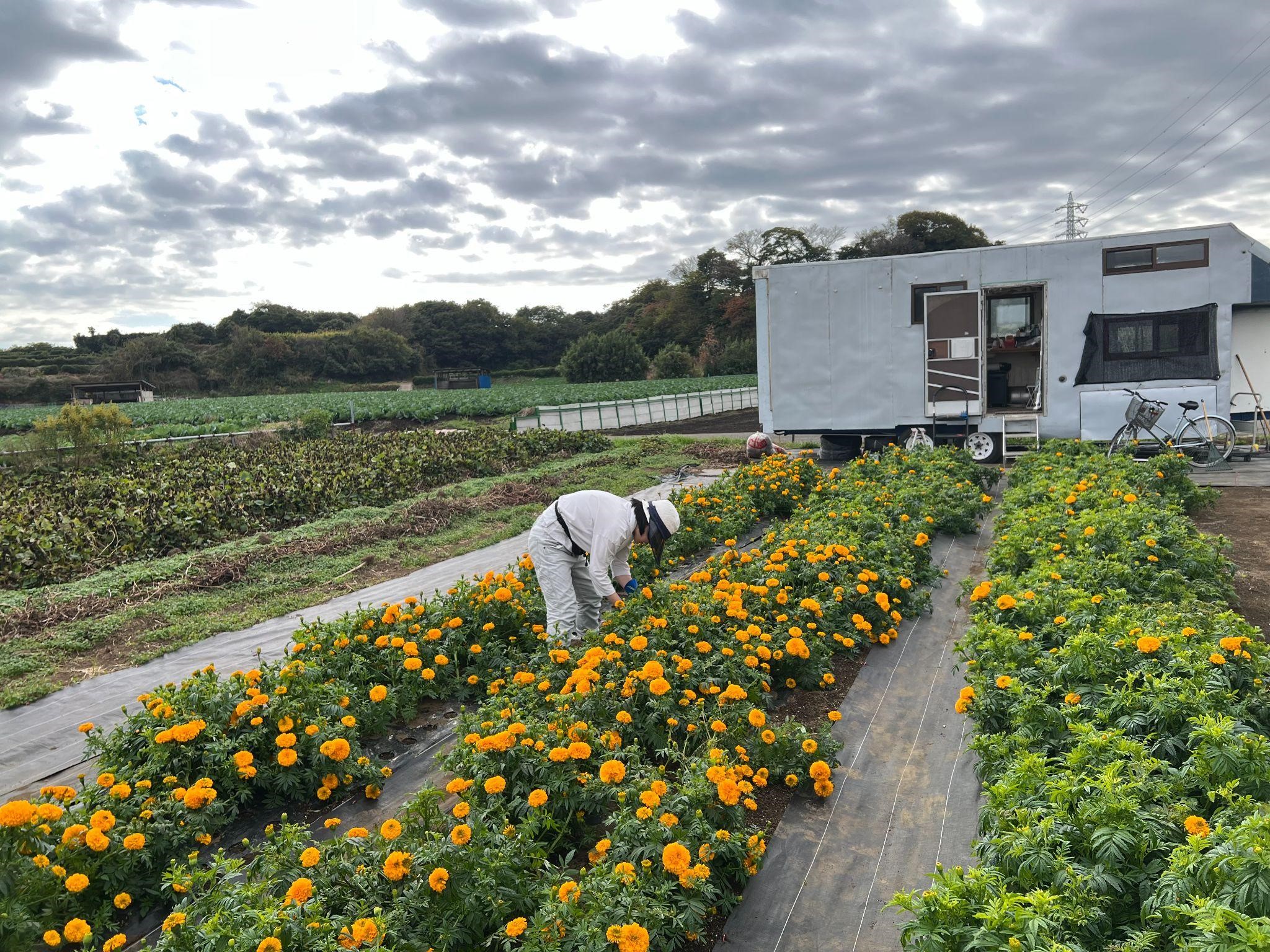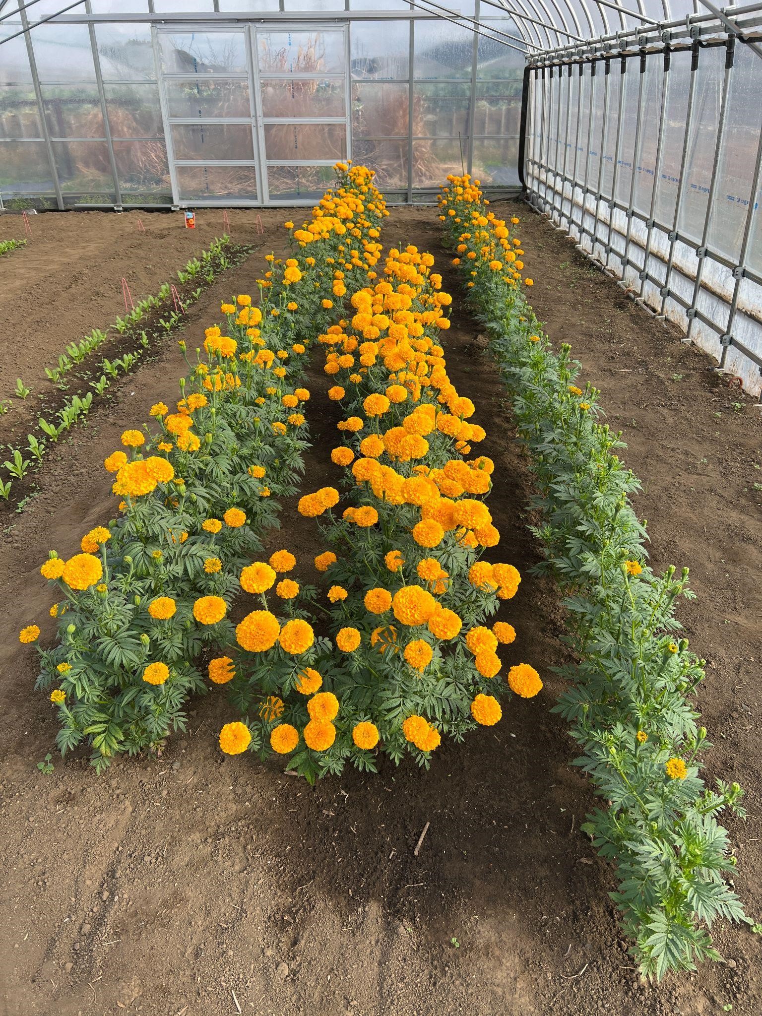 600坪の土地で季節のお花を栽培しており、お伺いした日は、ちょうどマリーゴールドが見ごろを迎えていました。
