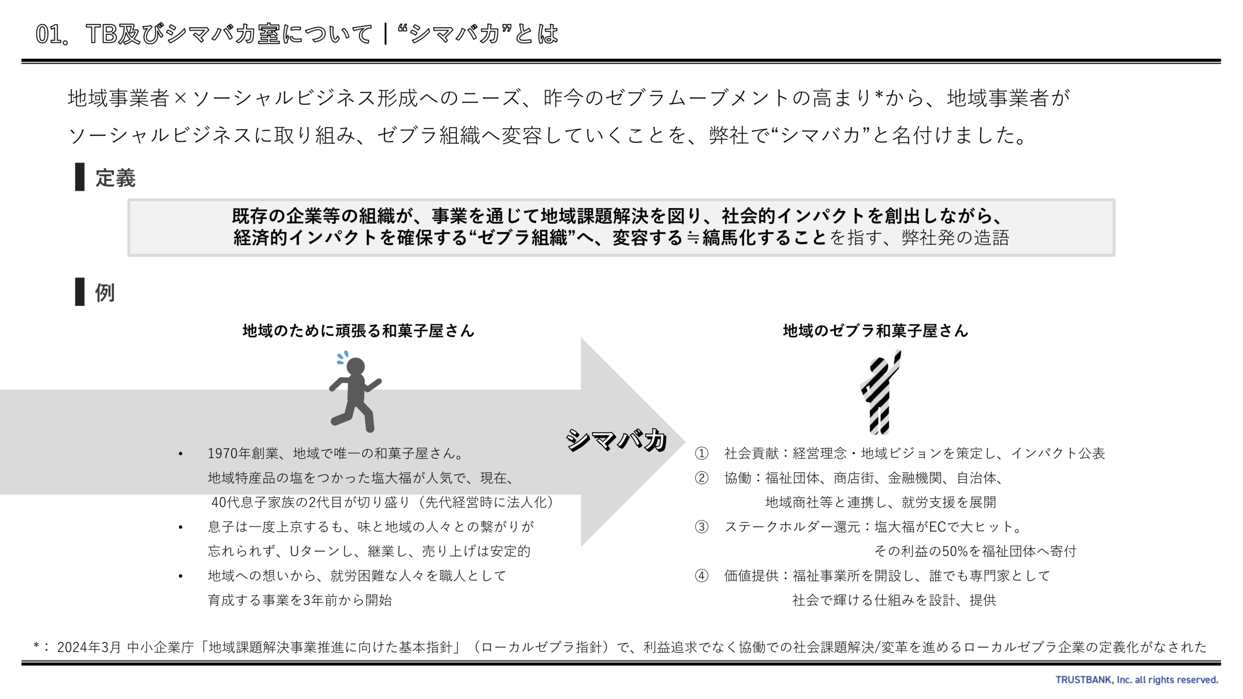 ※地域事業者がソーシャルビジネスに取り組み、地域の課題解決を図り、社会的&経済的インパクトをもたらす組織へ変容することを弊社で “シマバカ/縞馬化” と名付け、地域事業者のシマバカに向けた専門的サポートを展開しています。